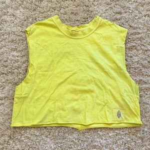 Bright yellow sleeveless, cropped and boxy top. Perfect breezy workouts or casual wear. 100% cotton with FP Movement logo on front. I wore this once, but it’s got that classic FP “worn in” softness. No signs of wear. Color is Highlighter and is sort of a neon yellow/sour grape.
