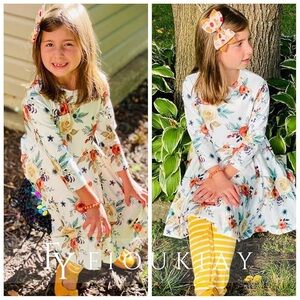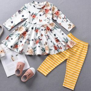 Charming floral dress with long sleeves. Paired with yellow striped leggings. Perfect for casual outings.