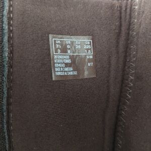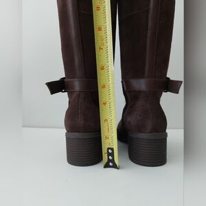 Step out in style with these elegant brown knee-high boots. Elastic side panel. Zip at side. Size 6.
