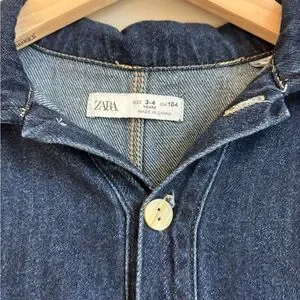 Adorable Zara Kids denim coverall in size 3-4 Years (104 cm). This one-piece jumpsuit features a classic utility/boilersuit style with front button closure, large patch pockets, and soft medium-wash denim. Perfect for everyday wear, photos, or a stylish playtime outfit.
