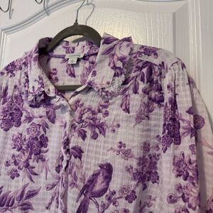100% cotton - gauze material - slightly longer hem in back - lightweight - purple and white with an adorable bird and butterfly novelty print - fringe hem and cuff detail
