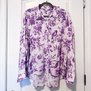Sundance Chantilly Blooms Birds Novelty Print Cotton Gauze Button Down Shirt L