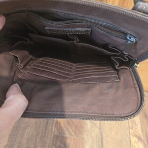 Elegant Fossil crossbody bag in dark brown leather. Features a front zip pocket and adjustable strap. Has many pockets, main pocket has lots of slots for credit cards. In great shape but used and pockets need a cleaning out possibly. Haven't taken time and if leather conditioned this bag would probably look brand new.