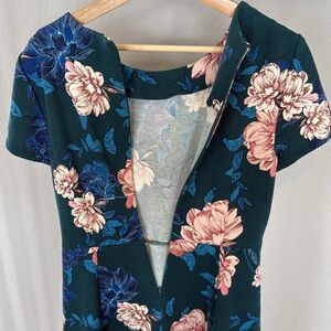 Beautiful mini dress with a floral design. Features short sleeves and a fitted waist. Excellent pre-owned, like new condition.