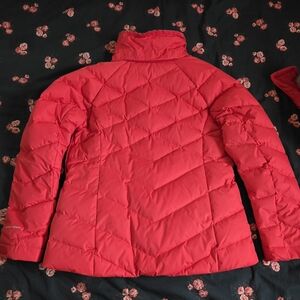 Vibrant red puffer coat by Columbia. Features a removable hood for adaptable style. Ideal for chilly days. filling is 75% duck down, 25% duck feather.