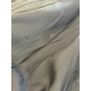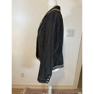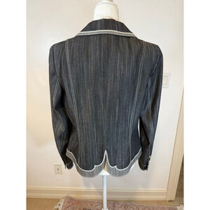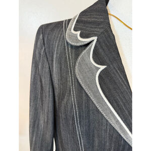 Escada women's blazer, size 42 (EU), features a dark gray denim-like exterior with white contrast stitching and scalloped white trim on the lapels and hem. It has a three-button front closure with gold-rimmed white buttons, and three matching buttons on each cuff. The main fabric is 100% cotton, and the lining is 100% viscose, with a subtle pattern. Visible imperfections include a lightened area on back of sleeve pictured. I just got it back from dry cleaners too. Please see pictures for details measurements and very good condition. I am accepting reasonable offers.
