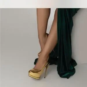 Elegant emerald velvet dress. Features long sleeves and a bold slit.