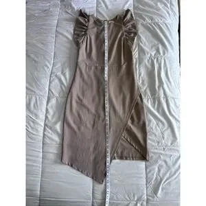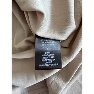 The LENA NYC Assymetric Dress in size Large and beige color is a sophisticated and elegant option for a night out. Featuring a high neckline, zip closure, and lined interior, this knee-length dress is perfect for various occasions such as weddings, parties, formal events, or even a casual night out. The dress is made of microfiber fabric with a touch of spandex for comfort and has a strappy sleeve design, making it a stylish choice for the summer and spring seasons. Perfect for those looking for a sexy and chic outfit.