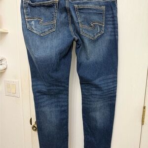 Stylish high rise girlfriend cut jeans by Silver Jeans. Features a classic blue distressed wash. Perfect for casual wear.