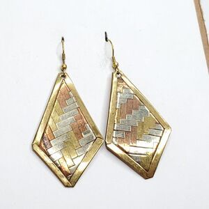 Artisan Earrings Copper Brass Silver Geometric Herringbone Dangle Drop Diamond