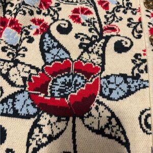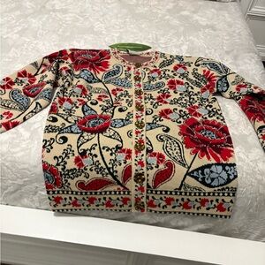 Chic floral cardigan with vibrant red and cream tones. Perfect for adding elegance to any outfit. New never used will fit a medium