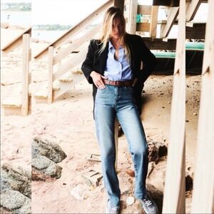 High waisted jeans with five pockets. Unfinished hem and side slits. Front zip and metal button closure.