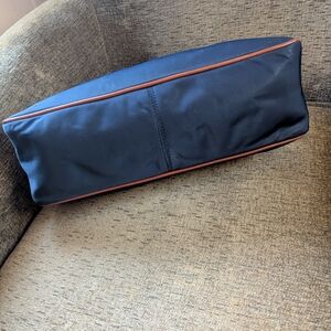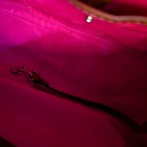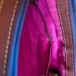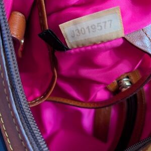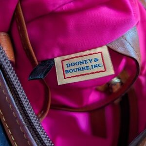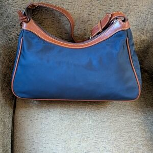 Vintage Dooney & Bourke Hobo Shoulder bag. Navy blue nylon exterior with hot pink nylon interior and chestnut brown/tan leather trim. Interior has a zippered pocket, two open pockets perfect for things you want to access quickly, and a key ring cord. A few spots of slight discoloration (all shown), one on outside left front corner, and others on interior. This purse has been loved and gently used, from a smoke-free home. Embroidered duck logo is very cute. It's lightweight and the perfect size!