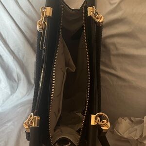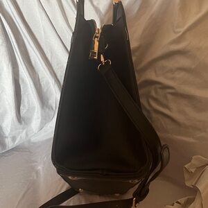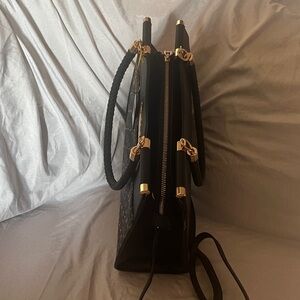 Chic Bebe shoulder bag with monogram design. Features black body and gold accents. Ideal for stylish outings.