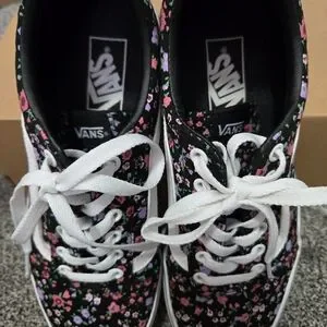 Vans sneakers with a black base and multicolor floral pattern. Features white laces and sole. Perfect for casual wear.