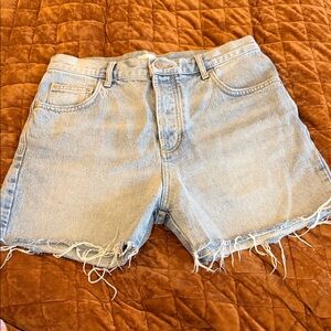 Chic light blue jean shorts. Features frayed hem. Ideal for casual wear.