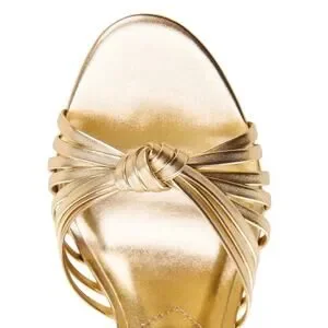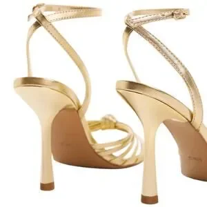 Women's Strappy High Heel Ankle Strap Sandals from Mango. These strappy high heeled sandals are a must have in your party footwear collection. Made from polyurethane, these strappy heeled sandals appeal with their metallic finish, funnel heel, rounded toe, ankle bracelet, buckle, knot detail, and inner lining. Ankle strap with adjustable buckle. Metallic finish. Strappy design. Perfect for holiday parties.