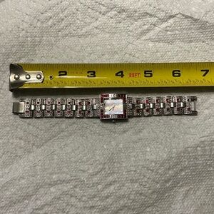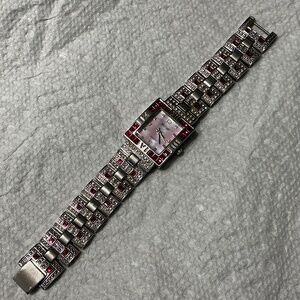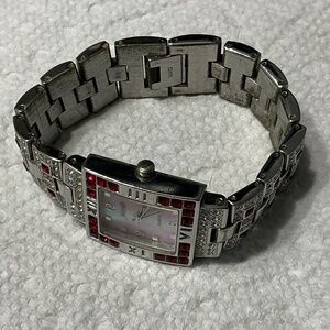 Nicolét Vintage Quartz Watch With Rectangle Face Featuring Faux Rubies & Diamonds. Gorgeous watch with an iridescent pink face, hour, minute and second hands. The square red stones surround the outside of rectangular face set in a silver toned metal. Each link of the band features two red stones. The clear round stones surround the rubies on the links that would be at the top and sides of the wrist. The two links at each end, that would be on the underside of the wrist, feature the red stones surrounded by raised metal dots. There are two red stones and one of the clear stones are absent. Some wear on the underside of band. Needs new battery. Absolutely stunning watch that catches eyes and compliments when worn. See photos.