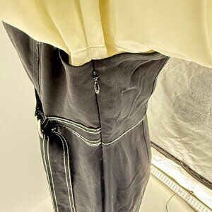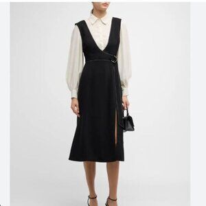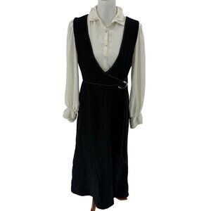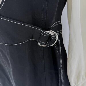This dress combines a tailored aesthetic with its black wrap-style overlay and white button-up shirt design. The D-ring belt adds a touch of sophistication.