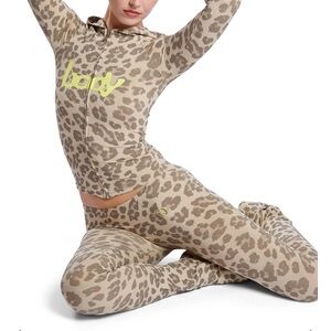 Hoodie and low-rise flared leggings set in ivory leopard/yellow. Brand new.