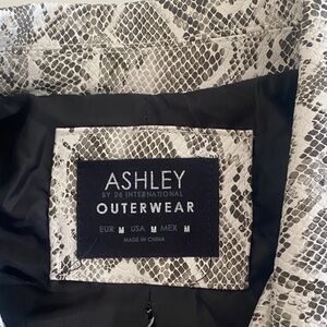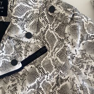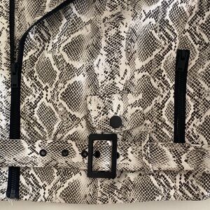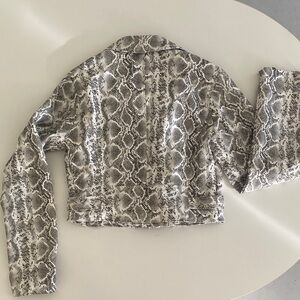 Chic faux leather jacket with a bold snake print and modern black zippers. Features a monochrome palette. Perfect for a stylish look.