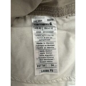 The product is a pair of Carhartt utility cargo shorts in tan khaki color, featuring a loose fit for added comfort and flexibility. Designed for men in a regular size 34, these shorts are perfect for casual wear and outdoor activities. With multiple pockets and a durable construction, these shorts combine style and functionality for a versatile wardrobe staple.