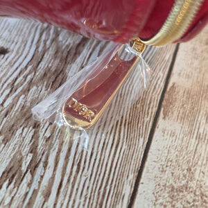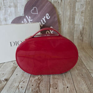 This is a new Dior vanity case, complete with its original box. The case is made of a glossy, red patent material with the Dior logo embossed on the front. It features a gold-tone zipper closure and a small handle. The item is in pristine condition, showing no signs of wear or damage.