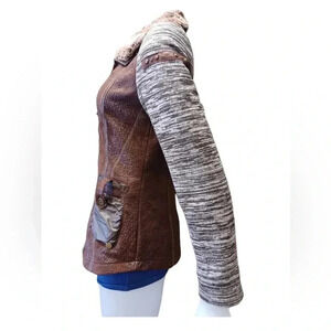 Multi textured, shades of tan and brown with faux fur collar, this jacket features two pockets, long sleeves with a zipper closure. All pulls and decals present.