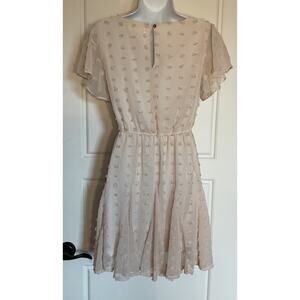 The Juliana's Off White Party/Sunday Flutter Sleeve Dress in size small is a stylish and elegant choice for any party or cocktail event. Made of polyester, this knee-length dress features short flutter sleeves and a flattering flare style. The beige color is perfect for summer and spring occasions, and the brand Juliana's ensures quality and sophistication. Whether you're dressing up for a special event or looking for a chic outfit for a day out, this dress is a versatile and trendy option for any fashion-forward woman. I did not like the original belt worn my own. Lost the belt.
