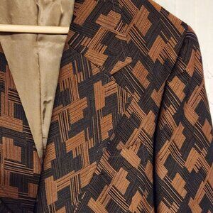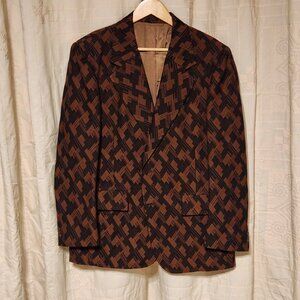 Groovy 1970s vintage statement blazer from "Rayburn's El Paso / Las Cruces". Features a bold chocolate brown and tan geometric "basketweave" pattern that screams disco era. Designed with wide lapels, a two-button front, and structured shoulders.