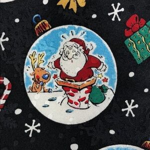 John Ashford 100% Silk Santa Tie. Christmas ornament design of Santa and his reindeer. New with tags. Excellent condition with no visible blemishes. Black background color. See photo of tag for fabric content and wash instructions. Macy’s. 58.5 inch length. Widest width 4 inches.