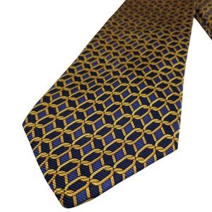 Keywords: mens tie, silk tie, geometric pattern, chain link, navy tie, gold tie, formal wear, business attire, dress tie, necktie, designer tie, classic, sophisticated