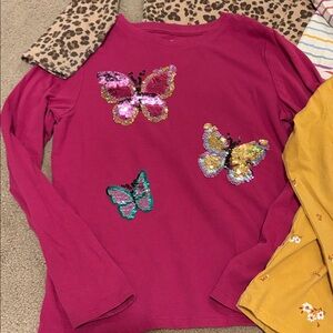 Lot of four long sleeve shirts. Includes leopard print, colorful stripes, pink with sequin butterflies, and mustard with floral design.