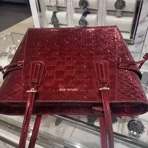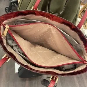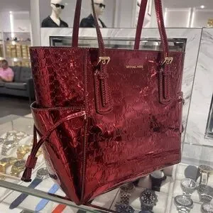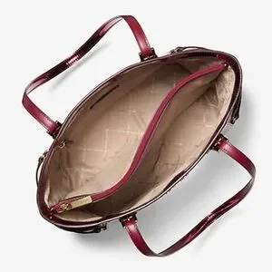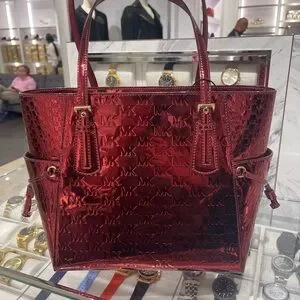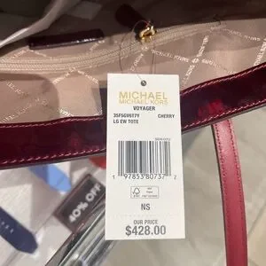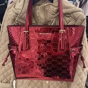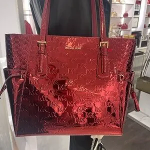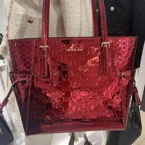 MICHAEL KORS Voyager Lg Metallic Logo Debossed EW Shoulder Tote Bag Cherry NWT