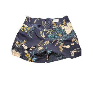 These are new with tags shorts in size XL, featuring a navy background with a yellow and teal floral and bird pattern. The shorts have a flat front with an elasticized back waistband and two side pockets. The material appears to be a lightweight woven fabric. No visible imperfections are present. The tag indicates "Regular Fit" and "Short Court."