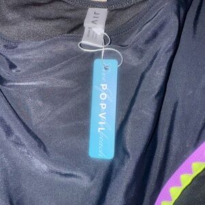 Make a splash with this stylish black one-piece swimsuit, featuring eye-catching pink, yellow, and purple trim. Perfect for a fashionable beach day.