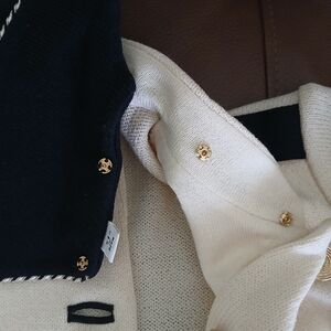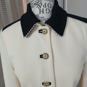St. John Santana Knit Longline Blazer. Very light stains on the left sleeve and with a repaired hole at the right sleeve as shown in last photos . Size 2