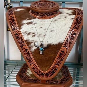 New Steer Bull Longhorn Cowgirl Cow western faux turquoise silver pendant 2”