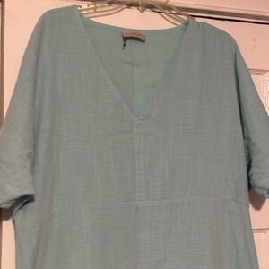 Elegant light blue dress with a V-neck design. Perfect for casual outings. Dress made by Nomad, 100% cotton dress has splits on the sides