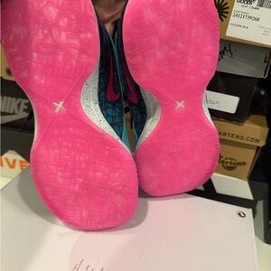 Step up your game with these Nike athletic shoes. Featuring a striking teal and pink design with bold neon green accents, these shoes offer both style and performance. Perfect for any athletic activity. COME WITH BOTTOM PART OF BOX, no top