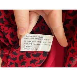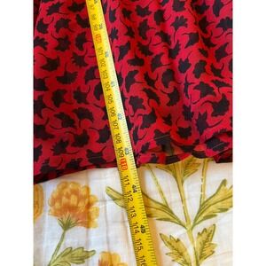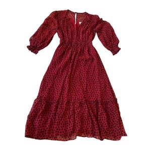 Beautiful Eden Red Ginkgo Midi Dress from Shoshanna, women's size 2. The Eden dress is made from 100% silk chiffon with a red background and black ginkgo fan leaves printed on it. The dress is midi length featuring 3/4 blouson sleeves, a V-neck, tiered ruffle skirt, and fitted elasticized waist. Single button closure at neck, pull on style. Built in liner.