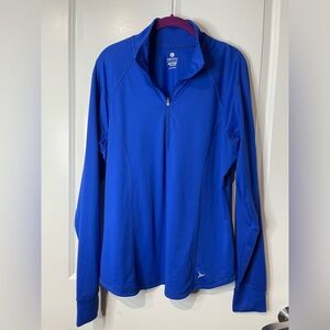 Blue. P2P 23”. Length 26”. Size X-large 94% polyester 6% spandex