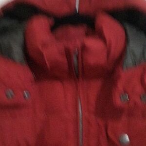Stylish deep red puffer jacket. Features a hood and multiple pockets. Perfect for cold weather.