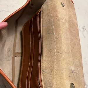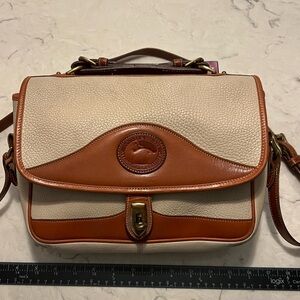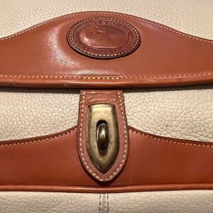 Classic shoulder carrier bag with rich brown leather trim. Perfect for travel and storing electronics. Features a timeless design and quality. Some signs of wear inside - pen marks. Color:Bone pebbled All Weather Leather with British Tan Trim and Brass hardware. Intact tag with serial number on back, begins with A8. Dating it to late 80’s - true classic. Original boss babe bag.