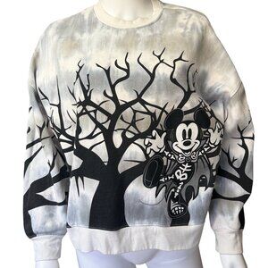This crew neck sweatshirt features a gray and black tie-dye design with a Halloween-inspired Mickey Mouse graphic, long sleeves, and soft cotton blend for casual comfort.