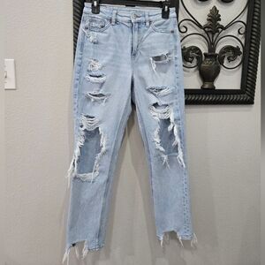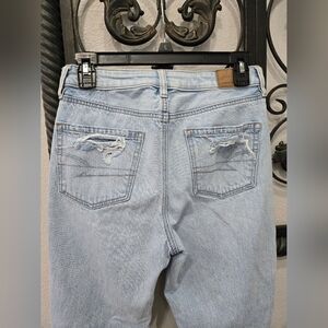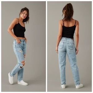 Stylish light blue boyfriend jeans. Features distressed details. Comfortable and trendy fit. American Eagle light blue mom jeans in great condition! Size 0 Reg.