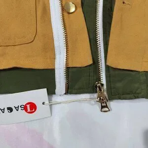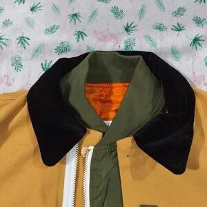 Khaki workwear style with a corduroy collar; the military green zipper lining contrasts with the orange lining, accented with gold metal zippers and buttons.