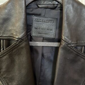 All Saint Catch black leather biker jacket with quilted shoulders. Features zippered pockets and sleek design. Ideal for versatile styling. Super cute just haven’t worn that much two tiny specs on collar but hardly noticeable and in great condition