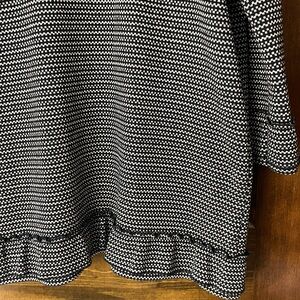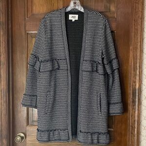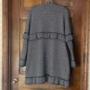Jack by BB Dakota long cardigan, black and white design, stretch fabric, decorative ruffle embellishment around sleeves/chest/cuffs/hem, size L, excellent condition