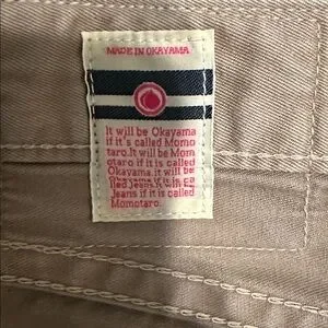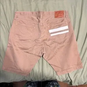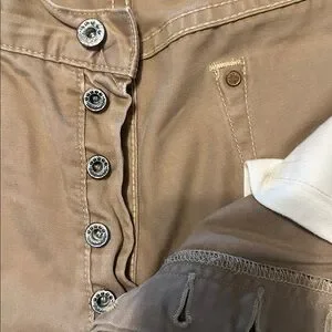 Khaki shorts with metal buttons and copper rivets. The shorts are also selvedge. The dimensions are as followed: waist 36, length 10.5, thigh 12 inches.